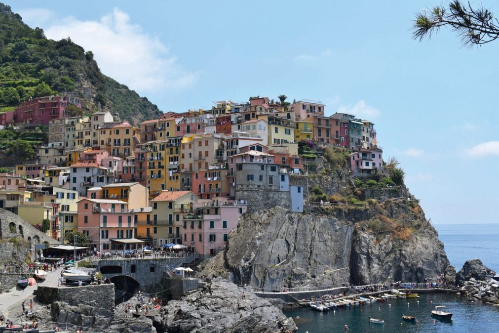 Manarola, que nous rallions en train, est lovée dans un amphithéâtre de vignobles. Ce village est pourvu d’une seule rue qui descend vers une minuscule plage rocheuse. En l’absence de port, les barques sont remontées par une grue et déposées de chaque côté de la chaussée. Riommaggiore conclut notre circuit. Nous nous souviendrons du contraste entre les rochers noirs et les nuances pastel des maisons.