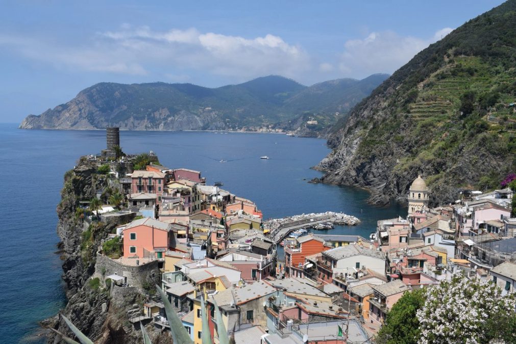 Nous démarrons une randonnée à Corniglia. De la gare, il faut gravir 400 marches pour atteindre ce village. Puis direction Vernazza par le sentier. Chaussez-vous bien et ne marchez pas trop le nez en l’air, le bord de la falaise n’est jamais loin. Après 2 heures, Vernazza apparaît sur son promontoire rocheux. Une tour médiévale rappelle les périodes tumultueuses de la commune. Les vieilles ruelles, porches et loggias agrémentent la visite.
