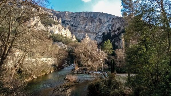 Les lieux sont souvent bondés l’été venu, mais malgré le beau soleil presque printanier qui nous accueille, c’est dans un calme presque parfait que nous découvrons le village rendu célèbre par le gouffre et la résurgence d’où jaillit la Sorgue et qui a inspiré tant de poètes et d’artistes au fil des siècles, tant la puissance de ce site est forte. C’est sans doute par cette douce journée hors-saison que nous pouvons encore le mieux l’apprécier, même si la force des eaux n’est pas encore à son maximum. Au moins nous sentons-nous, tels les poètes d’autrefois, pleinement en contact avec cette nature extraordinaire et la poésie des lieux agit totalement.