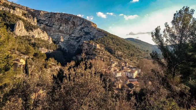 Nous débutons notre balade à rebours du chemin traditionnellement suivi par le flot de visiteurs - bien modeste aujourd’hui - en nous élevant vite au-dessus du village et du site, par une rue puis un sentier qui nous fait déjà grimper sur les contreforts des Monts du Vaucluse. Nous surplombons ainsi le Vallat des Baumes Noires, qui coule doucement. Les lieux sont beaux et calmes, la végétation typique du climat méditerrannéen qui règne ici.