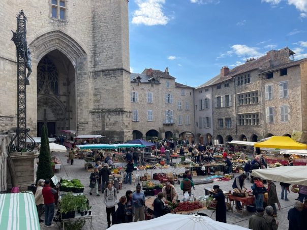 Il est midi. Le clocher de la collégiale de Villefranche-de-Rouergue sonne. Sur la place centrale les locaux, touristes vont et viennent dans les commerces de la bastide. Ici, on se familiarise avec les spécialités locales à base de farçous, une sorte de galette de blettes et d’ail, on déguste aussi les pleurotes, le canard sous toutes ses formes, et bien entendu les plaisirs sucrés composés de fouace, croquande, gâteau à la broche, échaudés, etc.