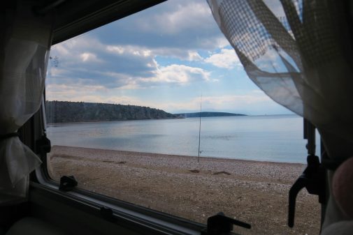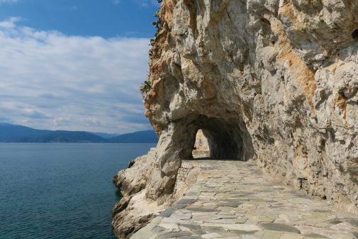 Que vous arriviez en ferry à Patras ou par avion à Athènes (avec location de camping-car sur place), Nauplie est un bon point de départ pour un road-trip en direction du nord. Ici, vous serez directement plongés dans l’ambiance chaleureuse des villages grecs. Un immense parking, le long du port, accueille gratuitement (mais sans service) les camping-cars. Il n’est pas particulièrement beau, mais pratique et offre une vue imprenable sur la forteresse de Palamidi – qui s’illumine la nuit – au-dessus de la ville. Les plus courageux graviront les quelque 825 marches qui permettent de l’atteindre et de jouir d’une vue imprenable sur Nauplie et le golfe Argolique. Les autres se contenteront, comme nous, de la forteresse d’Acronauplie et de la magnifique promenade d’Arvanitia, entre mer cristalline et pentes abruptes couvertes d’asphodèles et de figuiers de barbarie où se réfugient les nombreux chats errants.