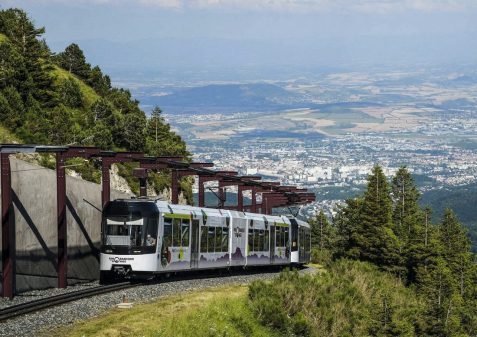 Il est toutefois possible d’en atteindre le sommet sans verser une goutte de sueur en empruntant le Panoramique des Dômes, le train à crémaillère qui en une quinzaine de minutes vous fera profiter d’une vue “panoramique” au cours de l’ascension. Depuis la gare de départ située au niveau du parking, ce convoi grimpe en colimaçon, à flanc de colline. Les passagers profitent alors des verdoyants paysages auvergnats avant d’admirer la vue à 360° sur la chaîne des puys, une fois arrivés à la tête du “Géant”. A noter qu’il est possible de monter en train et de redescendre à pied en empruntant le sentier de randonnée.