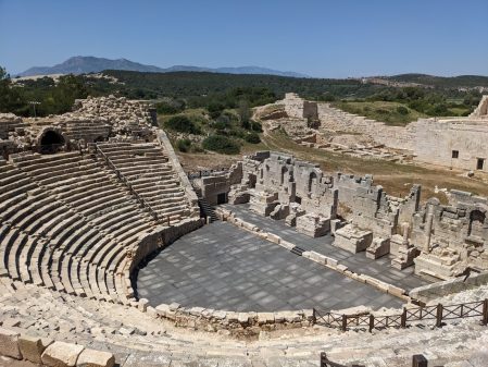 Après quelques kilomètres parcourus, Patara nous éblouit par son grand théâtre, son bouleutérion complètement reconstruit et sa superbe rue du port bordée de colonnes ! Ce sublime endroit est situé à l’arrière de la plus longue plage de Turquie, aux 18 km de sable. Impossible de ne pas s’y baigner. C’est aussi un lieu de ponte des tortues Caretta caretta qui viennent chaque année y ensevelir leurs œufs. Impossible donc d’y bivouaquer !