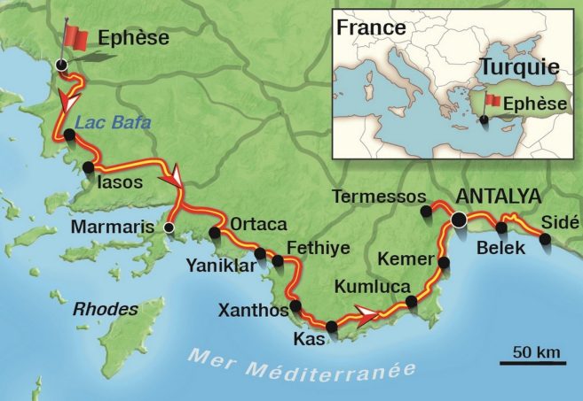 Si les routes sinueuses et pentues (plusieurs passages à 10 %) ne vous effraient pas, faites une incursion sur la péninsule de Marmaris. On quitte les bords de la mer Egée, pour longer la Méditerranée et parvenir dans la région de Lycie dont le nom vient de la civilisation antique qui occupait cette aspérité géographique, au sud-ouest d’Antalya. La célèbre côte turquoise s’étire devant vous…