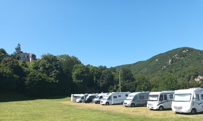 Parking gratuit accessible toute l’année. 30 emplacements (sans déballage donc) au pied de la cité. Accès par la rue de l’Ecole. Eau et WC. Une aire de services se trouve sur le parking du Super U de Gourdan-Polignan (D825), 6 km plus au nord.