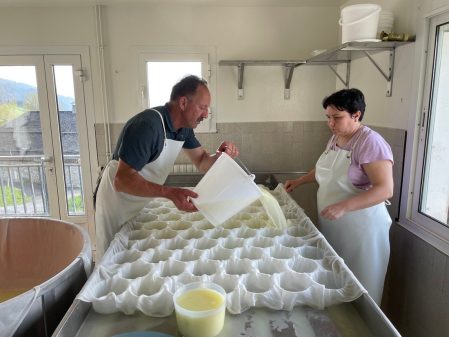 Après la traite, les étapes sont simples et doivent être réalisées dans l’ordre. On débute par l’étape du caillage qui doit durer une cinquantaine de minutes avec ajout de présure. Le décaillage, réalisé avec un geste bien maîtrisé par Nathalie, prend environ 7 mn. Cette étape de découpe permet de transformer les gros blocs du caillé en grains. Sur un grand plan de travail, les moules sont posés, une immense toile de lin humidifiée vient les recouvrir. Puis, suivent le remplissage, le moulage, le pressage et la pause sous couverture avant de retirer la toile (pendant une heure).