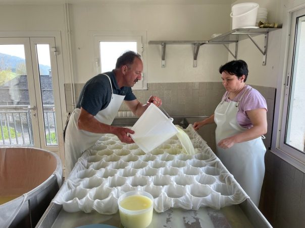 C’est aux Confins, hameau de La Clusaz, que l’on rencontre Thierry et Nathalie Agnellet, éleveurs et producteurs de Reblochon fermier et de Tomme de Savoie IGP, dans leur exploitation familiale. Comme évoqué précédemment, la traite a traditionnellement lieu deux fois par jour : aux alentours de 5 h et 18 h. La journée, les vaches se répartissent sur près de 55 ha de terrain.