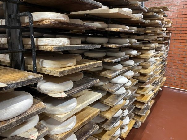 Fondamentale, l’étape de l’affinage permet aux fromages de “vieillir” avant d’être dégusté. Ceux qui arrivent chez l’affineur sont déjà fabriqués dans les fermes au préalable. Ils doivent d’ailleurs y rester huit jours (préaffinage) avant d’entamer le processus en cave. Sur de grands chariots, les fromages sont posés sur le bois d’épicéa. On distingue du bois neuf, sur les parties inférieures et supérieures, du bois ancien, au centre, qui va permettre de favoriser l’ensemencement. Dès lors la planche de bois d’épicéa est utilisable à l’infini. Quand elle se casse, cela signifie qu’elle est en fin de vie. Chaque jour, tous les Reblochons sont retournés à la main. Il faut savoir que selon la hauteur de la planche sur laquelle le fromage est posé, les bactéries sont différentes. Chaque fromage est donc unique ! Il va rester quinze jours au frais pour cumuler un total de 21 jours entre la production et l’affinage. Au terme de cette période, le fromage est commercialisable. Mais pour parler de l’AOP Reblochon, il faut plus de jours ! On en dénombre de 40 à 45 au total. A savoir que ce fromage se périme au bout de 70 jours à compter du jour de la traite, soit de sa première fabrication…
