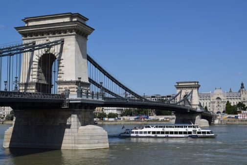 Nous poursuivons jusqu’au pont des Chaînes. Ce surprenant ouvrage d’art fut le premier à enjamber le Danube. Long de 380 m, il a été inauguré en 1849, après 20 ans de travaux. Pour l’époque, ce fut une véritable prouesse technique car les suspentes, composées de deux chaînes, sont accrochées entre les arcs des deux piles. Deux lions de pierre en surveillent l’entrée.