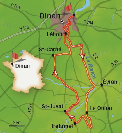 De retour à Dinan, poursuivez quelques instants sur la rive gauche qui prend une allure plus sauvage. Musardez aussi plus haut dans les ruelles anciennes aux 115 splendides demeures à pans de bois colorés. Pour une sortie plus courte, à Saint-André-les-Eaux ralliez la Voie verte par la D64, pour ne totaliser que 32,7 km.