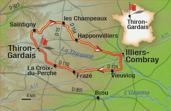 Peu après être passé au-dessus de l’autoroute l’Océane, voici l’exceptionnel château de Frazé qui décline tours et bâtiments s’étageant du Moyen Age à la Renaissance, avec un superbe parc paysager. Quittant la vallée de la Foussarde, en suivant le balisage de la Véloscénie, le parcours zigzague entre les fermes et les hameaux campagnards, avant de plonger vers le vallon de Thiron-Gardais. Sur place, profitez aussi des petites balades pédestres. Pour un circuit plus court rejoignez directement Frazé depuis Happonvilliers, soit 38,5 km au total.