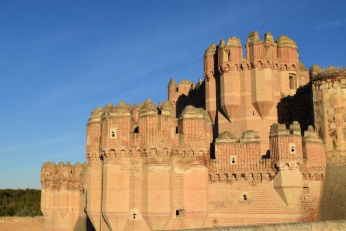 Avant Ségovie, nous passons par le château de Coca (stationnement facile), une fortification unique en Espagne pour son style mudéjar. Les chrétiens bâtisseurs utilisaient les techniques et influences arabes. Deux enceintes entourées de douves sèches, qui empêchaient les adversaires de “miner” les courtines, protègent un puissant donjon défendu par une herse et un pont-levis. Le tout mesure 560 m de long ! Une prouesse architecturale et artistique. Les murs de brique s’enflamment au soleil levant, révélant toute sa beauté.