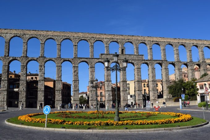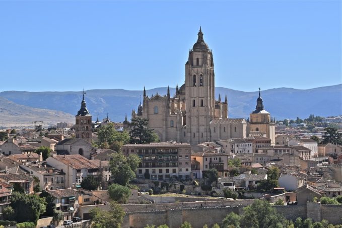 Les petites routes SG-342 et CL-605 traversent d’immenses champs, ponctués de quelques villages en partie désertés. Et enfin, posée sur le seul promontoire rocheux du secteur, apparaît Ségovie. Nous rejoignons l’aire gratuite de la plaza de Toros (lat. 40.940706/long. -4.107896) située à 20 mn à pied du centre-ville. Nous suivons l’aqueduc romain qui alimentait la ville (l’eau était captée à 14 km). Sur deux étages d’arches de granit, il atteint 28 m de haut. Sur la plaza San Martin, on découvre l’église romane et sa triple galerie extérieure. On apprécie les belles demeures seigneuriales autour de la statue de Juan Bravo, un opposant au pouvoir royal qui avait décrété un impôt jugé injuste par la majeure partie de la population. Un peu plus loin, la cathédrale du XVIe siècle, de style gothique, éblouit par sa forêt de pinacles et les décorations parfaitement restaurées.