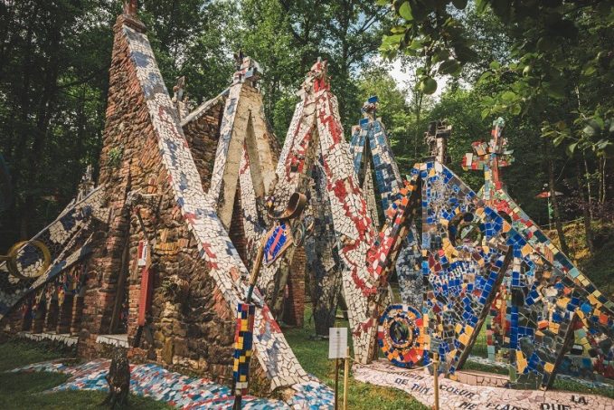 Plus de 80 noms de divinités, prophètes, artistes… parsèment les arches, les mobiles, les parements recouverts de mosaïques colorées, qui ne sont pas sans rappeler celles de Gaudí, encore lui, visibles à Barcelone. Les carreaux servant à ces dernières ont été fabriqués par le maître ou récupérés ici et là, en particulier dans la décharge de l’usine d’émaux de Briare (Loiret), à quelques kilomètres.
