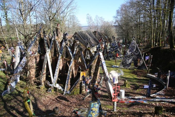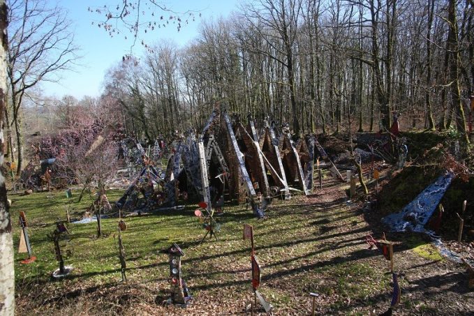 Vingt-deux ans et deux compagnes plus tard, c’est ici, après l’échec pour des raisons administratives d’un projet artistique collégial, qu’il commence à édifier son œuvre majeure, en pleine forêt de Neuvy-Deux-Clochers. Au départ chapelle, cette dernière deviendra église, puis cathédrale au fur et à mesure de l’avancée des travaux qui dureront jusqu’à la mort du potier, céramiste, sculpteur, graveur et architecte, en 2010.