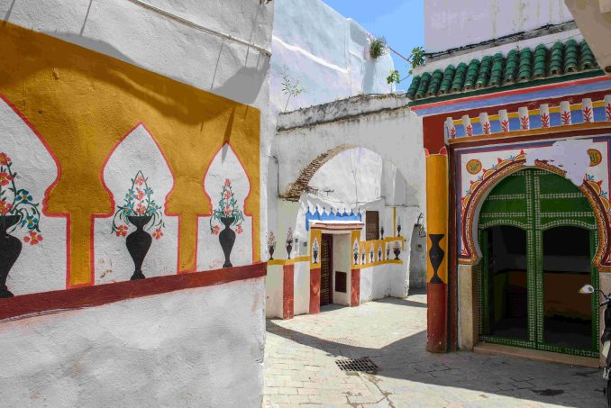 A partir de cette place, laissez-vous guider par le cheminement des ruelles colorées, pavées de galets polis par les babouches. Les teintes blanches, azurs et mauves des façades contrastent avec les volets bleus. Ces mélanges de couleurs éblouissantes étaient censés éloigner les insectes. Dans le quartier Al andalous, arpentez les ruelles aux bleus indigo ponctuées de superbes portes cloutées et de minarets vieux roses. On monte et on descend sans cesse, découvrant les ateliers, les boutiques, les portails en fer à cheval tout en humant les délicats parfums de menthe et de coriandre.