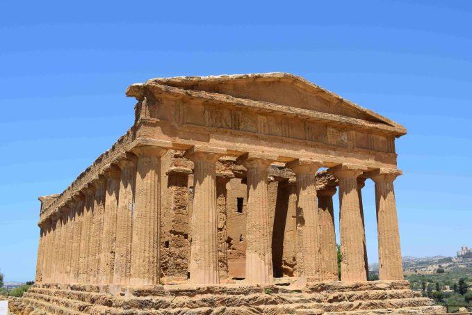 En 580 avant J.-C., des colons grecs débarquent de Crète et de Rhodes. Ils trouvent l’endroit idéal pour y construire des lieux de culte. La vallée des temples est née. Le site occupe une longue crête portant un ensemble de temples doriques. Nous nous précipitons vers le mieux préservé, le temple de la Concorde. Ironie de l’histoire, les chrétiens le transformèrent en église, ce qui lui évita d’être détruit. Rendu à son état antique, en 1748, il possède un entablement parfaitement conservé. Ses colonnes formées de quatre tronçons sont amincies vers le haut pour paraître plus grandes. On peut encore voir les métopes qui séparaient des scènes, sur un fronton en parfait état.