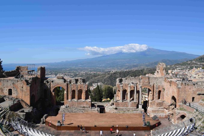 S’y garer relève de l’exploit. Ratant le petit parking gratuit [GPS : N 37°50’55” / E 15°17’11”], on se retranche sur celui du bas de la ville (8 €/heure). Vingt minutes de grimpette, et nous voilà à admirer les places de la ville, dont celle du Duomo avec sa belle fontaine baroque, et celle d’Aprile aux terrasses avenantes, aux maisons et bâtiments aux façades pastel. Au bout du corso Umberto, jalonné de boutiques de luxe, nous parvenons au théâtre gréco-romain du IIIe siècle qui fait la célébrité de la cité. Construit en brique, il offre une vue exceptionnelle sur la mer Ionienne et sur l’Etna qui laisse échapper ses fumeroles à l’horizon. Les gradins pouvaient accueillir 4 000 spectateurs, faisant de ce théâtre antique le plus grand de Sicile. L’acoustique y est exceptionnelle. Certains visiteurs s’amusent d’ailleurs à déclamer quelques textes sur la scène.
