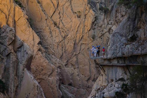 En entamant notre parcours, nous découvrons l’étroitesse des routes locales. Il faut redoubler de prudence pour atteindre le Caminito del Rey, à une heure de Malaga. Cette randonnée suit les méandres des gorges d’El Chorro sur une passerelle aménagée culminant parfois à plus de 100 mètres de haut. Édifiée entre 1901 et 1905 lors de la construction d’un barrage hydroélectrique, ses trois kilomètres de long testent votre rapport au vide…