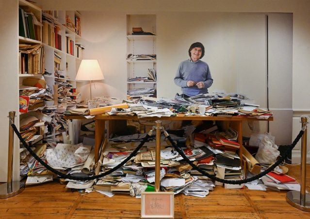La scène se passe au premier étage d’un bâtiment en pierres, à quelques encablures du centre historique de Châlons-en-Champagne. Derrière une porte à priori anodine apparaissent des dizaines et des dizaines de journaux et de magazines, empilés à la va-vite autour et sur un bureau où il ne reste plus aucune place. Des emballages de feuilles à dessin, des sacs plastiques, des classeurs ou encore des cartons sont aussi de la partie. Seul un minuscule carré, au milieu, reste vide, seulement perturbé par la présence de quelques crayons et d’encre noire.