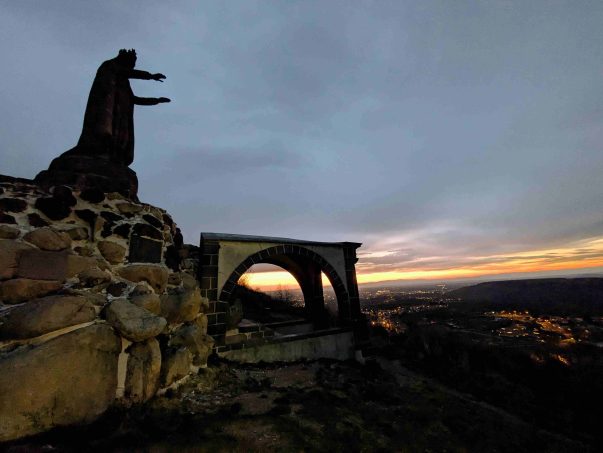 Nous entamons ensuite la descente en direction du village. On s’écarte toutefois un peu du sentier balisé pour aller admirer la statue de la Vierge qui semble bénir et protéger la plaine de la Limagne, les monts du Forez en face et la Chaîne des Puys. La ville de Riom est à nos pieds, Clermont-Ferrand un peu sur la droite. Ce belvédère signe la fin de notre randonnée car nous voici déjà revenu au parc des Sources, lequel nous invite à poursuivre notre découverte de la nature des anciens volcans. Mais pour récupérer de nos efforts, notre véritable conclusion se fera autour d’une truffade, d’une revigorante potée ou d’un savoureux Saint-Nectaire.