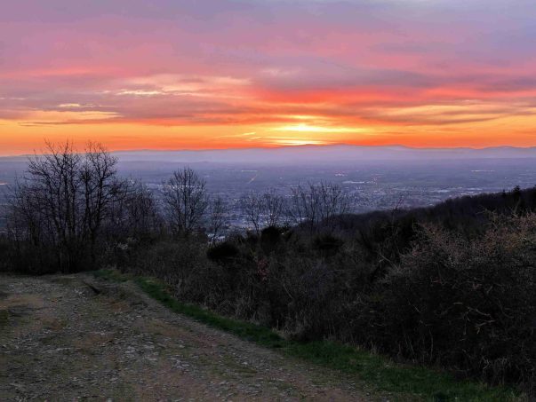 En quelques pas, nous nous retrouvons en pleine nature. Le parc des Sources, d’où jaillit l’eau de Volvic, est un trait d’union entre la ville et la montagne. On en profite pour remplir sa gourde avant de partir ! Les premiers hectomètres sont calmes, entre sous-bois et prairies, en pente douce. Le sol, de couleur sombre, est parsemée de roches volcaniques. Il nous rappelle bien la nature de cette moyenne montagne, autrefois théâtre de terribles éruptions.