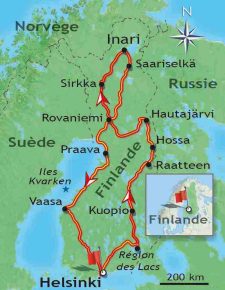 En poursuivant en direction du cercle polaire et de la Laponie, les troupeaux de rennes se multiplient… Il faut s’en méfier car leurs réactions peuvent être inattendues. Pour le symbole, nous choisissons de faire étape à Hautajärvi, ville où passe de cercle polaire arctique. On y trouve un centre d’informations qui marque le départ de la Piste de l’ours, randonnée de 82 km très prisée des locaux. Avis aux amateurs !