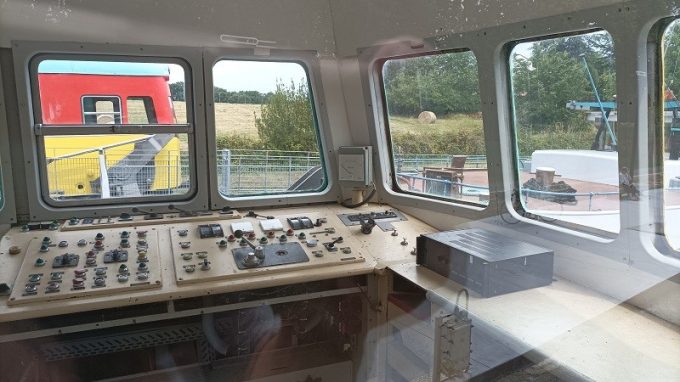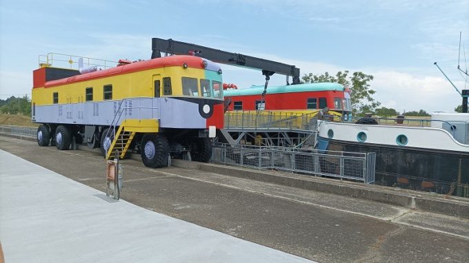 En premier lieu, il faut un ensemble tracteur à même de déplacer les 2 500 t d’eau du triangle. L’ingénieur jette son dévolu sur deux autorails montés sur pneumatiques – un de chaque côté de la pente d’eau – libérant au total 2 000 ch, et solidarisés par deux structures métalliques en partie haute. Secondement, il faut s’assurer que le volume du triangle d’eau reste suffisant, donc que celui-ci soit fermé hermétiquement dans sa partie avale. Pour ce faire, Jean Aubert développe le masque, une grande plaque de métal garantissant sinon l’étanchéité, du moins “une fuite acceptable”. Des rouleaux intégrés sur les côtés et en dessous viennent prendre appui sur les parois de la rigole et ainsi retenir l’eau. Bien sûr, pour libérer les péniches en fin de descente, ledit masque doit se lever, compliquant encore le système. Le dispositif hydraulique de bras articulés et de vérins qui en découle ainsi que les forces développées par ces derniers, donnent le tournis ! À la montée, la porte amont, basculante, s’efface d’elle-même lorsque la pression de l’eau s’équilibre entre les deux côtés.