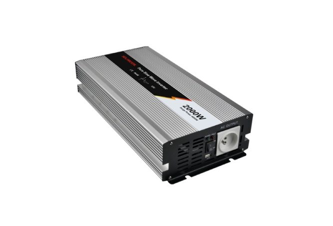 Ce modèle Solardeal 12V Pur Sinus (qui présente la forme de courant la plus proche de celle du réseau domestique) permet la conversion d’une tension 12 volts (tension continue) en une tension de 220-230 volts (tension alternative). Il affiche une puissance nominale de 2 000 W. Sa puissance de crête est, elle, de 4 000 W. Afin de favoriser la dissipation de chaleur et gagner un peu de poids, son boîtier est en aluminium.