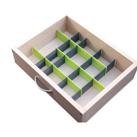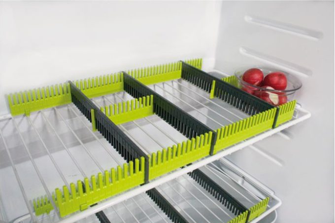 Les séparateurs PurVario se présentent comme de grands peignes qui s'emboîtent les uns dans les autres afin de pouvoir sécuriser le rangement d'aliment dans un réfrigérateur (réf. 15939416) ou de petits objets dans des tiroirs (réf. 15939415) de cuisine ou de salle d'eau. Chaque unité, prédécoupée, peut alors être adaptée à la dimension souhaitée.