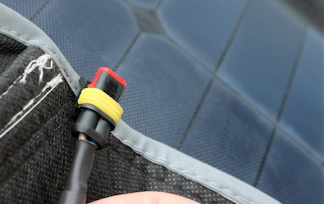 Constitué de différentes couches de protection (dix au total, dont huit d’isolant), le volet Thermosun dissimule dans sa partie basse (noire) deux panneaux comportant 36 cellules photovoltaïques. Branchées entre elles, ses 72 cellules fournissent 77 W et peuvent alors servir à recharger des appareils comme un smartphone, une tablette tactile ou un ventilateur via une prise intégrée sur le côté du volet relié à un fil de 5 m.
