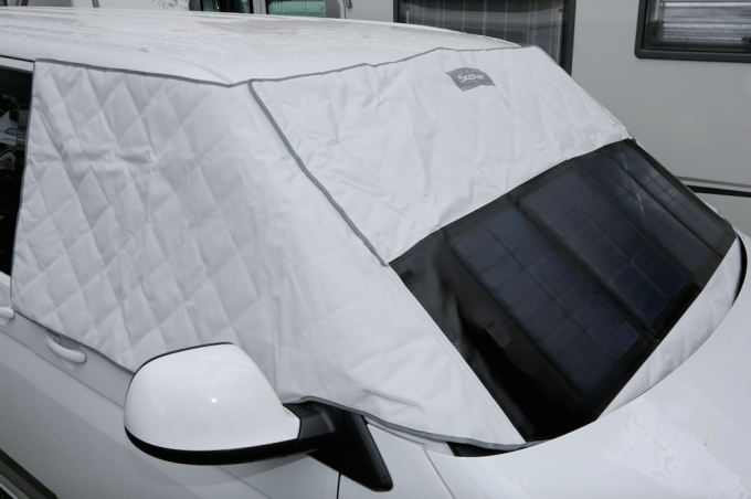 Cette nouvelle protection Soplair en plus d’améliorer l’isolation thermique du véhicule par l’extérieur au niveau du pare-brise intègre un panneau solaire.