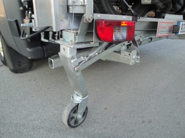 Etudié à son lancement avec un moteur électrique pour actionner la roulette de support permettant d’ouvrir facilement les portes arrière du véhicule, le porte-scooter fabriqué par VAT-Industrie troque aujourd’hui son système à vis et écrou à billes (actionné par un moteur 12 V) pour un petit vérin hydraulique. La disparition des différents fils et composants électroniques, au profit d’une pompe à actionner à la main, rend ce porte-scooter moins sensible aux pannes de batterie. Cette simplification du mécanisme permet également de rendre cet équipement plus accessible avec un tarif en baisse de 1 000 €.