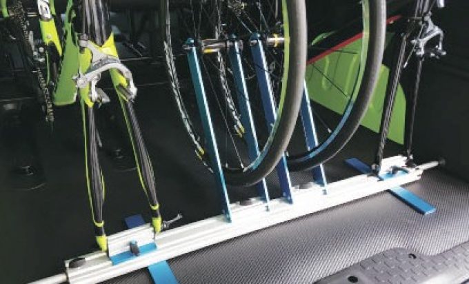 Développé par la marque suisse Easyin, ce porte-vélos embarqué se présente sous la forme d'un rail (en alu anodisé de qualité) à fixer directement dans la soute de votre camping-car (en position transversale) à l'aide de deux points d'encrages montés sur pas de vis (de 103 à 180 cm d'écartement possible).