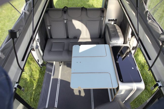 Le bloc, qui regroupe réchaud, évier et rangements, est ainsi aménagé dans un Volkswagen Transporter à deux portes coulissantes. Ce modèle Van intègre par ailleurs une table de dînette constituée d'un plateau en trois parties, dont deux rabattables, faisant office de façade. Un second plateau, non modulable, est prévu sur l'autre côté du meuble afin d'être utilisé à l'extérieur.