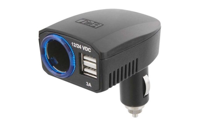 Proposé par T'nB, cet adaptateur 3 en 1 se montre l'accessoire idéal. Grâce à sa tête pliable, il conviendra à tous les types de planches de bord. Son entrée allume-cigare peut supporter des produits demandant beaucoup de puissance (jusqu'à 8 A) comme une glacière. Grâce à une puce intelligente intégrée, ses deux ports USB (2x5 V de 4,8 A) permettent de recharger très rapidement les appareils. Petits plus, son contour s'illumine en bleu pour un accès facile dans toutes les conditions de luminosité. Il intègre aussi un fusible de sécurité de 10 A.