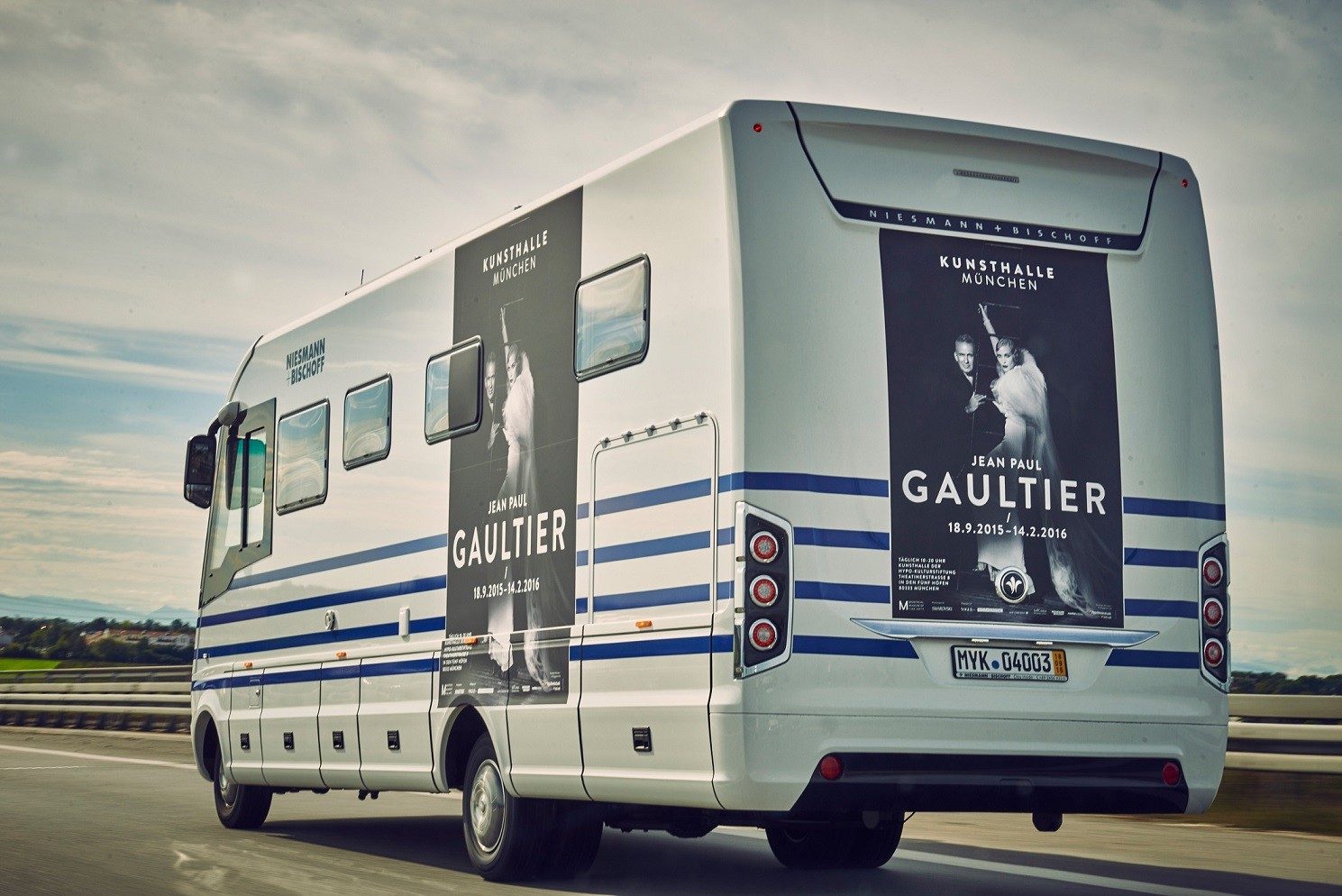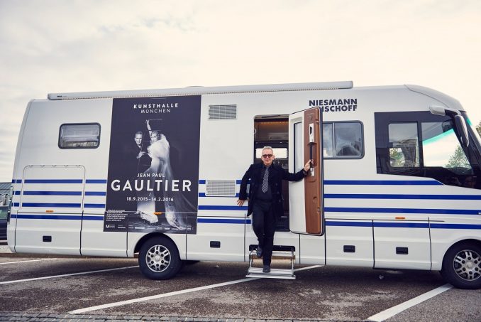Précisons ici qu’il s’agissait du trajet d’une quarantaine de kilomètres séparant l’aéroport munichois du lieu de l’expo qui se déroule jusqu'au 14 février 2016 à la Kunsthalle, au centre de la métropole bavaroise. Le créateur français a ainsi pu apprécier les nombreuses fonctionnalités et le confort de ce superbe camping-car, habillé pour l'occasion à ses couleurs, avec les rayures bleues de ses fameuses marinières.