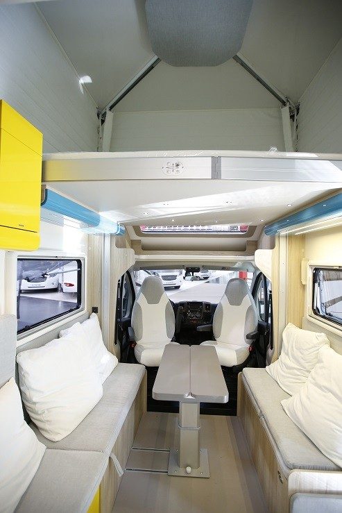 Le réchaud est une plaque à induction doubles feux, le réfrigérateur-congélateur, un modèle à compression, et chauffage et chauffe-eau sont également électriques. L’autonomie est assurée par un panneau photovoltaïque, placé sur la rehausse, mettant en charge une batterie au lithium. De quoi permettre de relever la structure métallique de la rehausse, abaisser le lit de pavillon (classique), déplacer la table de dînette ou encore redresser le dossier de banquette configurable en fauteuil. En outre, la consommation d’eau est optimisée au moyen d’un système d’injection d’air (diminution de la quantité d’eau) à l’intérieur du flux aqueux.