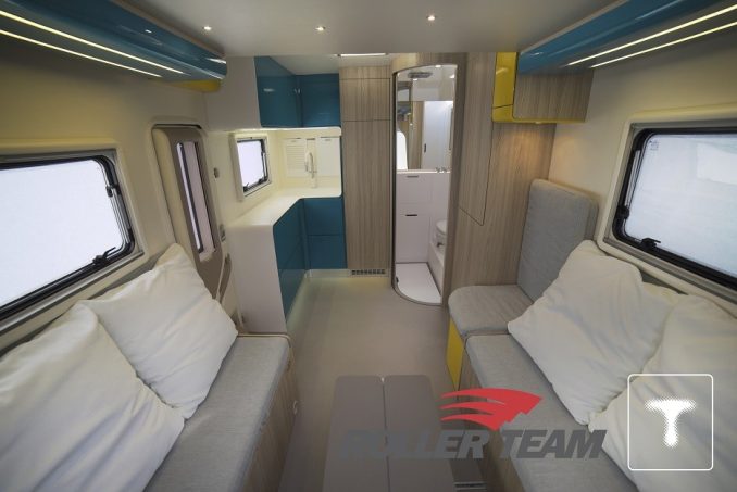 Les parois abandonnent le polyester au profit d’une résine laquée incorporant une fibre de basalte. Minérale et donc naturelle, cette matière allège la structure de 30 %. Un laminé antibactérien est utilisé pour l’ensemble monobloc de cuisine et sur la table, de l’Ecomalta revêt le sol, une structure alvéolaire d’aluminium, issue de l’aéronautique, est utilisée pour les placards de pavillon… Conséquence, le poids à vide du véhicule est évalué à 2730 kg.