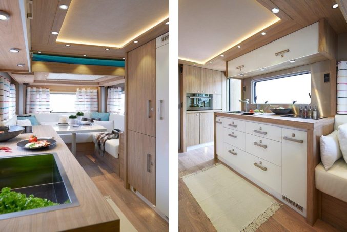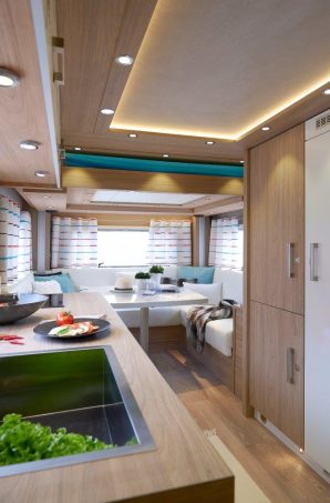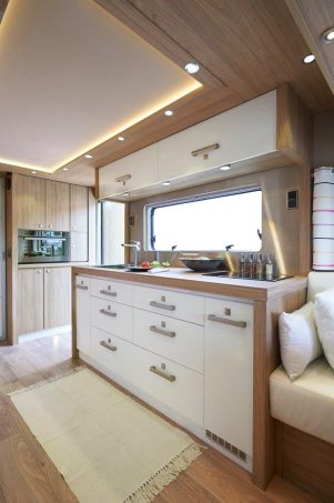 En termes d’aménagement, un lit de pavillon électrique de 160 x 200 cm descend au-dessus d’un vaste salon en U. La longue cuisine est équipée d’une plaque de cuisson deux feux Webasto fonctionnant au gasoil et d’un four domestique. Face à elle, de nombreux volumes de rangement dans lesquels un immense réfrigérateur à compression et une machine à laver trouvent leur place. Prêt pour l’aventure.