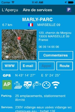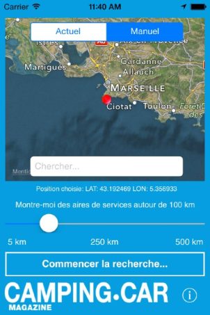 Camping-car Magazine lance sa toute première application pour trouver rapidement une aire de services ou une aire de stationnement.Utile, simple et facile à utiliser, cette application baptisée ''Aires C.Car'' vous permettra une recherche en mode ''Géolocalisation'' (à partir de votre position actuelle) ou en mode ''Manuel'' (en précisant votre destination dans le moteur de recherche). A partir d’une base de données exhaustive, une liste d’aires vous est présentée avec l’indication du type de site (aire communale, aire privée, aire de stationnement ou camping). Vous avez aussi la possibilité de visualiser toutes les aires sur une carte géographique. Vous pouvez également devenir un ambassadeur de Camping-Car Magazine, en commentant, en évaluant les aires que vous visitez et en déposant vos photos.Gratuite, cette application est pour le moment destinée aux appareils fonctionnant sous iOS (iPhone et iPad). Une version Android suivra prochainement.