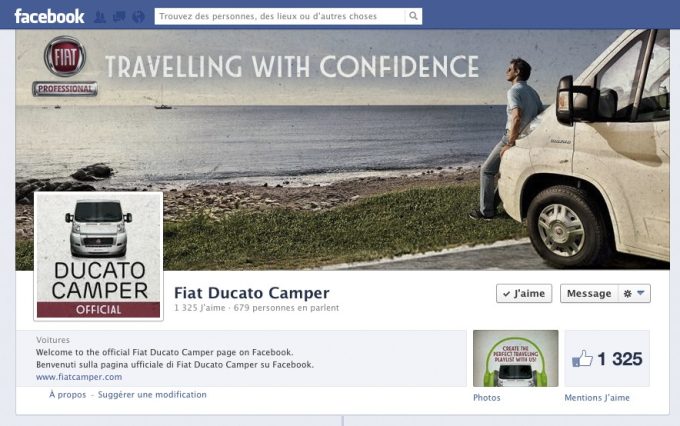 La page Facebook du Fiat Ducato Camper vise à répondre à l’intérêt croissant que les clients Fiat Professional manifestent sur les nouveaux services numériques. Cette page, disponible uniquement en italien ou en anglais, permet aux internautes d’intervenir, de commenter et participer avec photos et anecdotes sur leurs voyages. La communauté des propriétaires de camping-car sur Ducato pourra aussi obtenir des informations et éléments intéressants sur ce porteur.