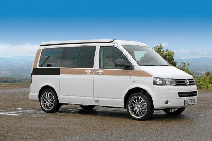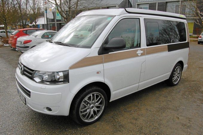 Sur ces images, qui nous sont parvenues d’Allemagne de notre confrère Promobil, on découvre ainsi un T5 à empattement court, doté d’un toit relevable permettant de loger un lit double. La silhouette générale du fourgon VW reste inchangée. A l’instar des différentes productions connues sur cette base, il passera sous les barres de hauteur à 2,00 m et pourra stationner dans la plupart des parkings souterrains. Pas de prise électrique apparente sur ce prototype, ni d’accès à un quelconque réservoir d’eau, mais une déco originale. La bande de ton bois sur la carrosserie blanche n’est pas sans rappeler le style d’un van américain.