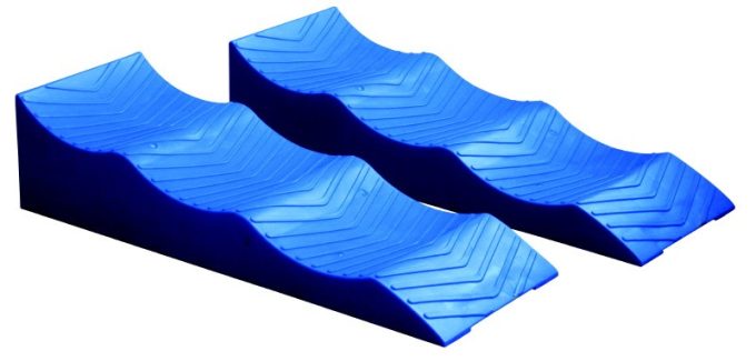 En polyéthylène haute densité traité anti-UV, ces cales de 60 cm de long, 21 cm de large et 14,2 cm de haut ont une capacité de charge de 2500 kg chacune. Leur dessin antidérapant et anti-ovalisation offre à la fois une bonne adhérence et épouse parfaitement la courbe du pneu, sur l'un de ses trois niveaux (4, 7 ou 10 cm). Dotées de poignées de transport, elles peuvent aussi recevoir, en option, des patins souples antidérapants (ci-contre) à fixer en amont.