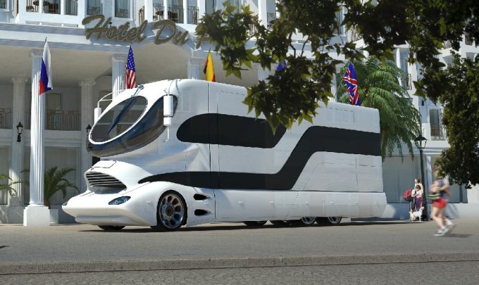 Imaginé par Mario Marchi, l'eleMMent Palazzo ne passera pas inaperçu s'il circule un jour sur la route. Pour l'heure, les illustrations présentées ici ne sont que des images de synthèse. Elles donnent cependant déjà une idée du look extérieur plutôt étonnant de ce camping-car futuriste à six roues de 12 m de long. L'intérieur de l'engin se révèle bien plus classique mais tout aussi étonnant et riche en équipements avec une surface habitable estimée à 40 m2.