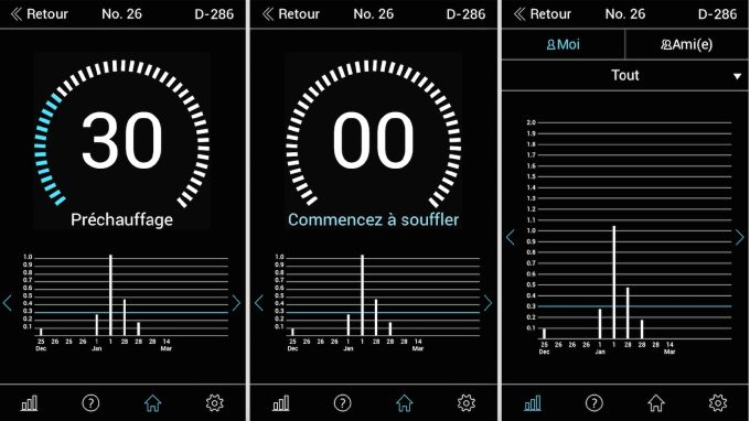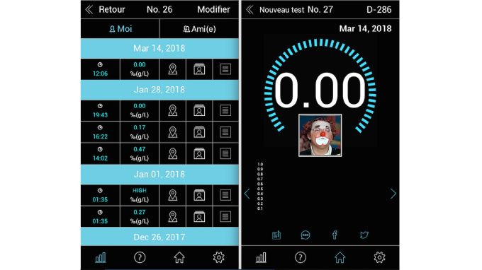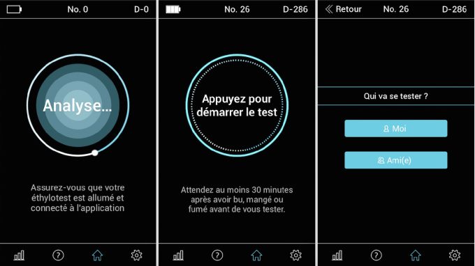 Dans le premier cas, il n'y a pas besoin de télécharger d'application. Un code couleur indique simplement sur l'appareil, avec des leds, quand souffler (lumière bleue) puis si le contrôle est positif (lumière rouge) ou que le seuil d’alcoolémie est inférieur à la norme autorisée (lumière verte).