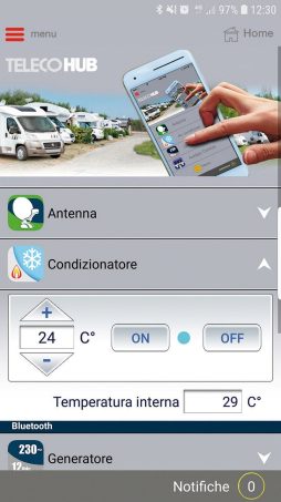 Jean & Viviane : Le Hub nous sert à plein d’autres choses que de piloter la clim’ à distance. Il nous permet de commander les éclairages intérieurs. On peut aussi replier la parabole de la télé en cas de coup de vent inattendu. Ça nous informe également sur les différents niveaux : celui des réservoirs d’eaux propres et usées et celui de la batterie auxiliaire. On peut même savoir si la porte du camping-car est ouverte ou fermée.