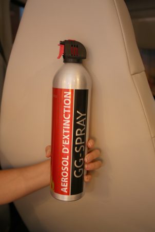 D'une contenance de 600 ml et ne dépassant pas 1 kg, le GG-Spray Stop feu est un flacon en aluminium, personnalisable à la demande, qui renferme un agent d'extinction pressurisé à 9 bars, biodégradable et non nocif (il ne laisse aucune trace après utilisation, contrairement à la poudre).
