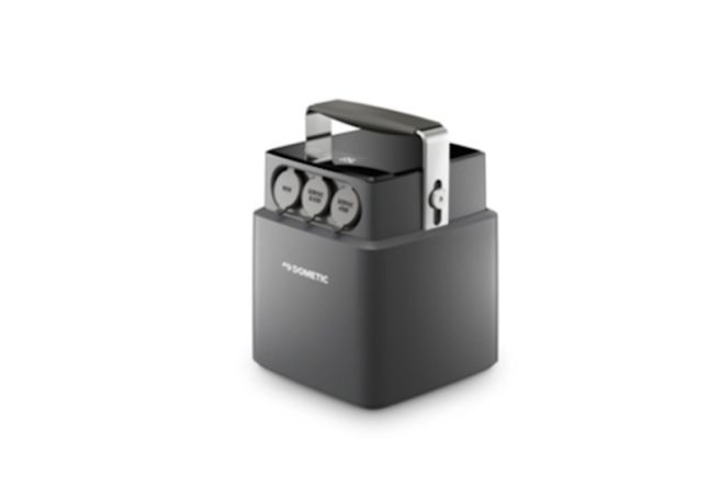 Etudiée par la marque allemande pour fournir de l’énergie électrique à différents équipements, telle sa glacière CFX 40W (durant 40 heures) ou bien des smartphones et tablettes, cette batterie lithium-fer-phosphate (LiFePO4) se présente sous la forme d’un petit cube de 25,5 cm de haut (pour 19,7 cm de côté) doté de trois prises en façade (USB, 12 V DC IN et OUT) avec capuchons étanches.